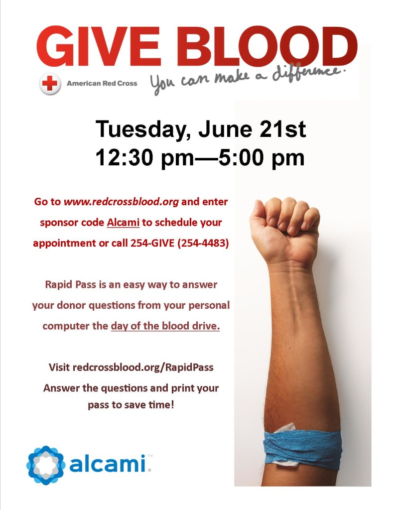 We work together at Alcami every day to do important work. But today, we want to accomplish something even more meaningful. The Red Cross has to collect 15,000 blood donations every day to have enough blood to help patients in 2,700 hospitals and transfusion centers across the country. That’s a lot of patients in need and all of us, coming together, can help ensure patients receive life saving blood.