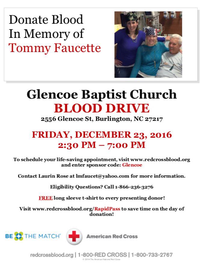 On October 6, 2016 my Dad, Tommy Faucette passed away after a 20 month battle with Leukemia. While battling his disease, my Dad received around 80 blood transfusions. Without these transfusions my Dad would not have had as much time with us as he did. In order to help give back and to keep my Dad’s memory alive, I am working with the American Red Cross and Be the Match to organize a blood and bone marrow registry drive in my Dad’s honor.