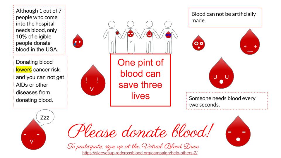 When my dad was two, he got in a traffic accident and almost lost his leg. If there was no donated blood he may have died. Because of this experience, he constantly donates blood since he believes in this charity. Since I can’t donate blood yet,(I am too young) I decided that I would advertise donating blood for my school project. So please donate blood! Thank you for your cooperation!