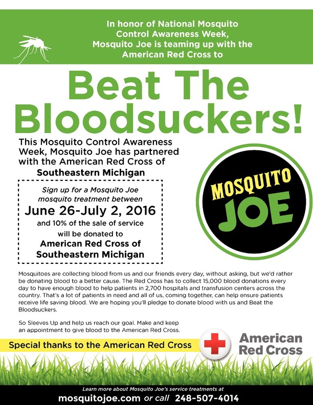 Mosquito Joe has partnered with American Red Cross for a campaign we call Beat the Bloodsuckers. Mosquitoes take a lot of blood without asking but wouldn’t you rather that blood donation be going to the American Red Cross? For any new customers that sign up for a Mosquito Joe service between June 26-July 2 a portion of their payment will go towards a donation we’re making to American Red Cross to help support the generous work they do. So if you’re thinking about trying out the service this is a great way to do it or if you know friends that might be interested please help us spread the word.
