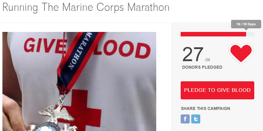 On October 28th, I will run in my 3rd Marine Corps marathon to raise awareness on the importance of donating blood. To align with this endurance event, I have created this Red Cross virtual blood drive with the hope of encouraging 26 people to pledge to donate blood. I am dedicating one mile to each donor that pledges, and will write every name on a piece of paper to carry with me throughout the race.