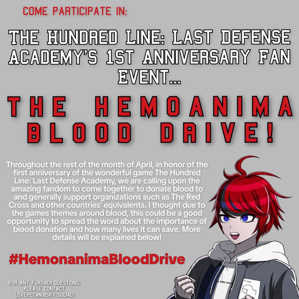 Throughout the rest of the month of April, in honor of the first anniversary of the wonderful game The Hundred Line: Last Defense Academy, we are calling upon the amazing fandom to come together to donate blood to and generally support organizations such as The Red Cross and other countries’ equivalents. I thought due to the games themes around blood, this could be a good opportunity to spread the word about the importance of blood donation and how many lives it can save. More details can be found on lovepecan.bsky.social!