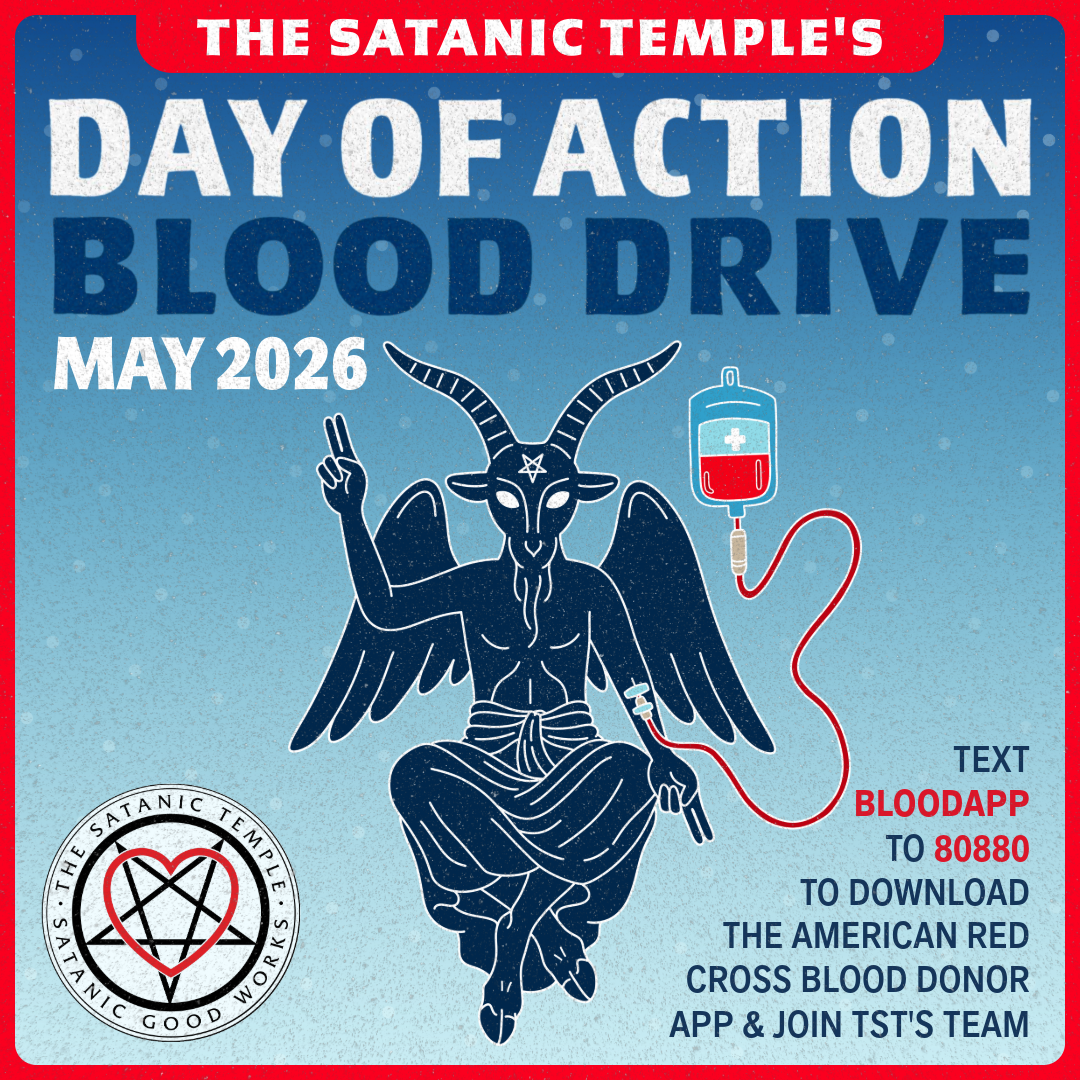 The Satanic Temple is launching its annual Day of Action Blood Drive on May 1, 2026, coinciding with the National Day of Prayer. We encourage everyone to move beyond just “thoughts and prayers” and instead take meaningful action by donating blood in their communities throughout May. Every two seconds, someone in the United States needs … Continue reading The Satanic Temple’s 2026 Day of Action Blood Drive