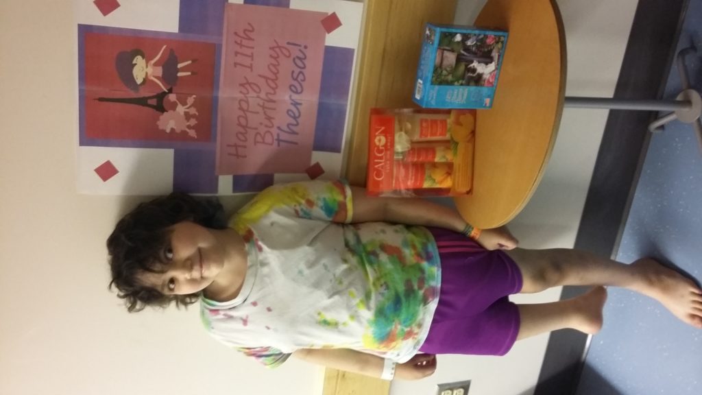 2 years ago Theresa was diagnosed with osteosarcoma and yesterday Theresa turned 11!! Theresa is still in treatment her blood and platelets are always taking a hit so we had to come in to clinic the day after her birthday for platelets and blood. We know Theresa does this so much that she makes a big dent in the east cost blood supply. Not just Theresa actually, but all little kids with cancer.