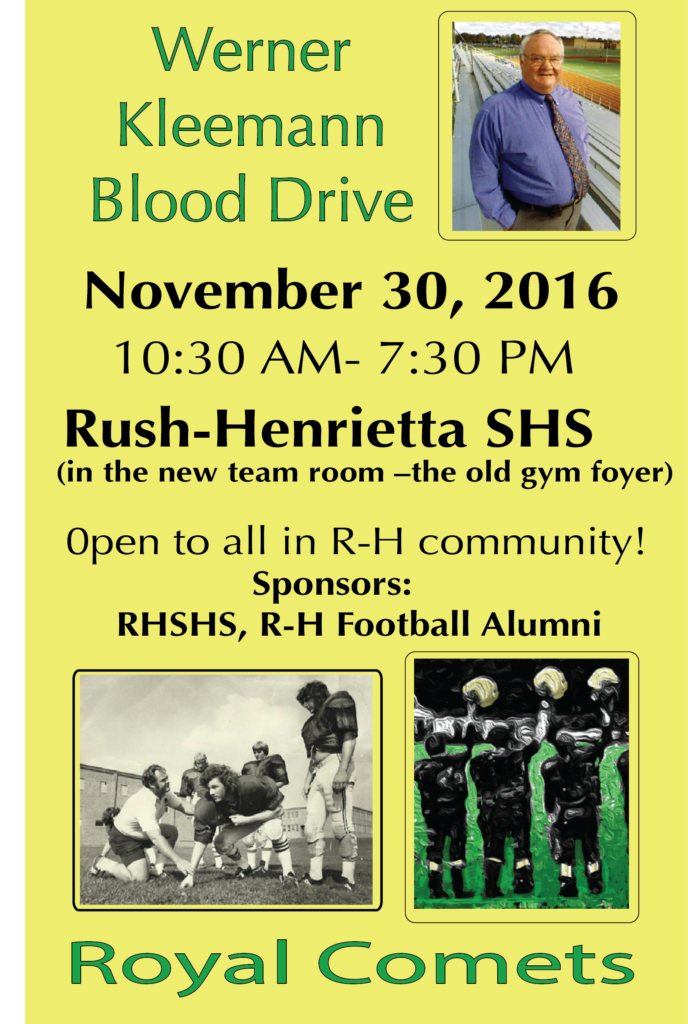 We proudly announce The First Annual Friends of Werner Kleemann Blood Drive. Those wishing to donate blood in honor of Coach Werner Kleemann are invited to report to the Rush-Henrietta Senior High School on November 30th between 10:30 am. and 7:30 pm.